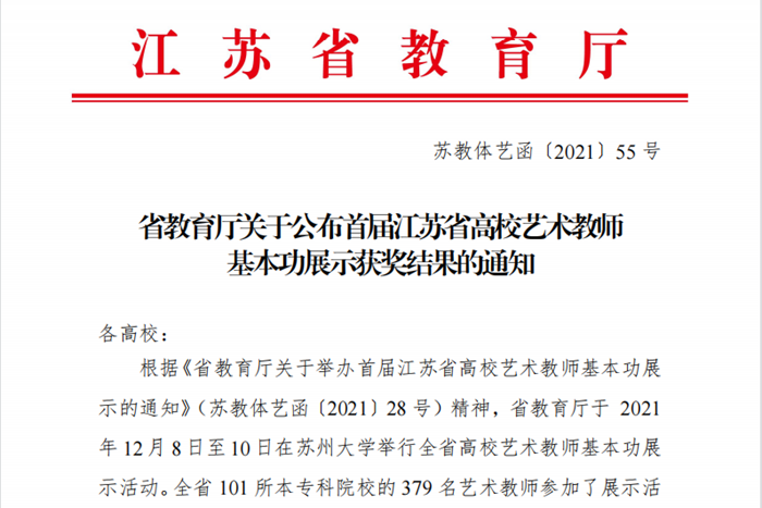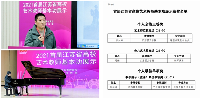 近日,由江苏省教育厅主办的首届高校艺术教师基本功展示在苏州大学举行,来自全省101所高校的379名选手参加展示。经过激烈角逐,我校艺术设计学院李加涛获得艺术师范教育组个人全能三等奖和教学展示(微课)最佳单项奖,教育学院周鹏获得公共艺术教育组个人全能三等奖。
