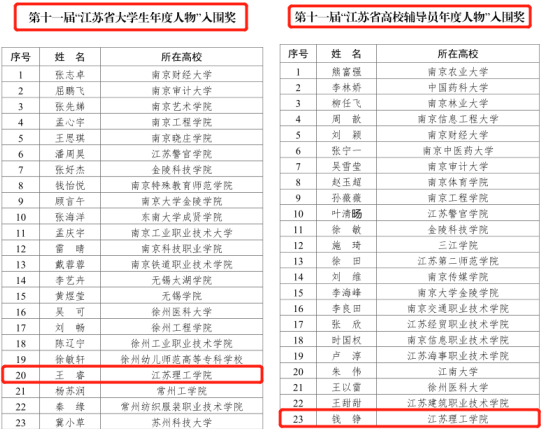 近年来,我校始终把立德树人作为根本任务,理解三全育人新意蕴,推进协同育人新战略,构建思政育人新范式,积极推进“榜样引领”活动,在学生和辅导员中涌现出一批优秀典型。在前不久揭晓的第十一届“江苏省大学生年度人物和高校辅导员年度人物”暨2021年“最美大学生”“最美辅导员”评选中,我校机械工程学院机械设计制造及其自动化专业2019级王睿荣获第十一届“江苏省大学生年度人物”入围奖;电气信息工程学院钱铮荣获第十一届“江苏省高校辅导员年度人物”入围奖。( 图/文 学生工作处 姜小军;审核/王振伟;编辑/杨茗茜)