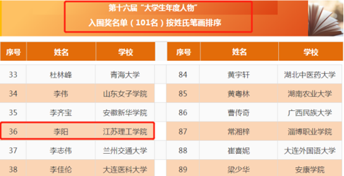 近日,由教育部、人民日报社共同指导,人民网、光明日报社教育部、《大学生》杂志、中国大学生在线联合主办的第十六届“大学生年度人物”推选展示活动发布评选结果。我校材料工程学院材料成型及控制工程专业的2018级李阳荣获中国“大学生年度人物”入围奖。