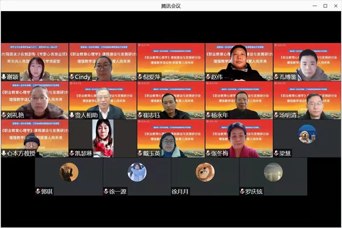 2月15日上午,我校召开2022年课程建设与发展线上研讨会,校《职业教育心理学》教学团队专兼职教师及教育学院心理学系、心理教育研究所的10多位教师、研究生代表参加会议。研讨会特邀全国优秀教师、常州市职业教育发展中心主任、正高级讲师杨永年,江苏省海门中等专业学校新职业教育研究所所长、正高级讲师崔志钰,江苏省高邮中等专业学校信息中心主任、正高级讲师汤明清,常州刘国钧高等职业技术学校心理健康中心副教授马学果等4位专家出席。