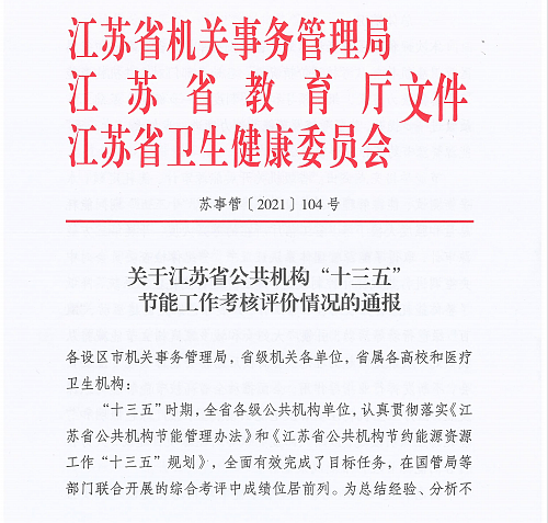 近日,江苏省机关事务管理局、江苏省教育厅、江苏省卫生健康委员会联合发文,公布江苏省公共机构“十三五”节能工作考核评价情况,我校被评为江苏省公共机构“十三五”节能工作优秀单位。这是我校继获评“2021年度江苏省公共机构节能低碳示范单位”后,又一项节能领域省级荣誉。