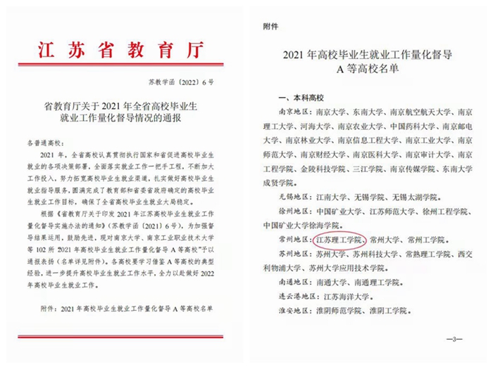 近日,江苏省教育厅印发《省教育厅关于2021年全省高校毕业生就业工作量化督导情况的通报》(苏教学函〔2022〕6号),我校获评2021年高校毕业生就业工作量化督导A等高校, 这是学校连续第二年获评该项荣誉。
