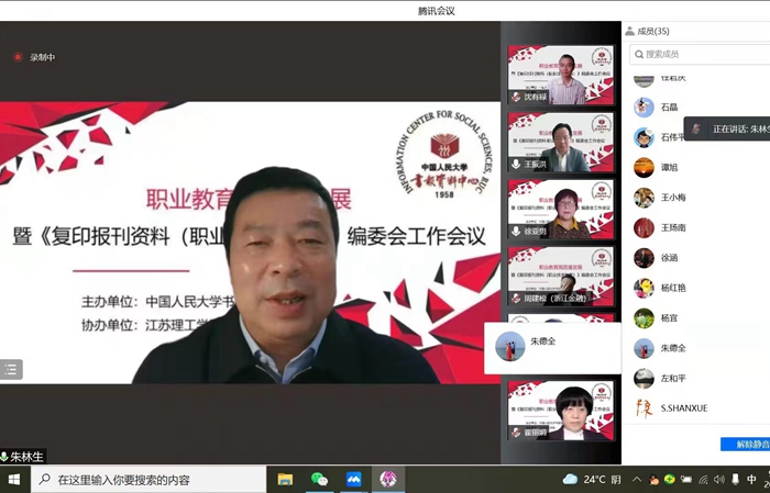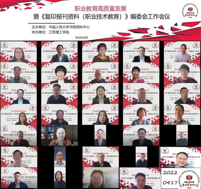 4月17日,由中国人民大学书报资料中心主办、我校协办的职业教育高质量发展暨《复印报刊资料(职业技术教育)》编委会工作研讨会以腾讯视频会议的方式召开。教育部职业教育发展中心主任、《人大复印报刊资料(职业技术教育)》编委会主任王扬南、我校党委书记朱林生、中国人民大学书报资料中心总编辑高自龙出席研讨会。来自北京大学、天津大学、华东师范大学、西南大学、上海教育科学研究院等高校和科研院所的30余名职教专家,围绕职教期刊如何高质量发展和“2021年度中国职业技术教育学术影响力评价方案”等主题进行交流研讨。