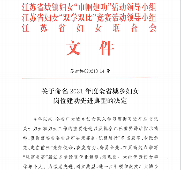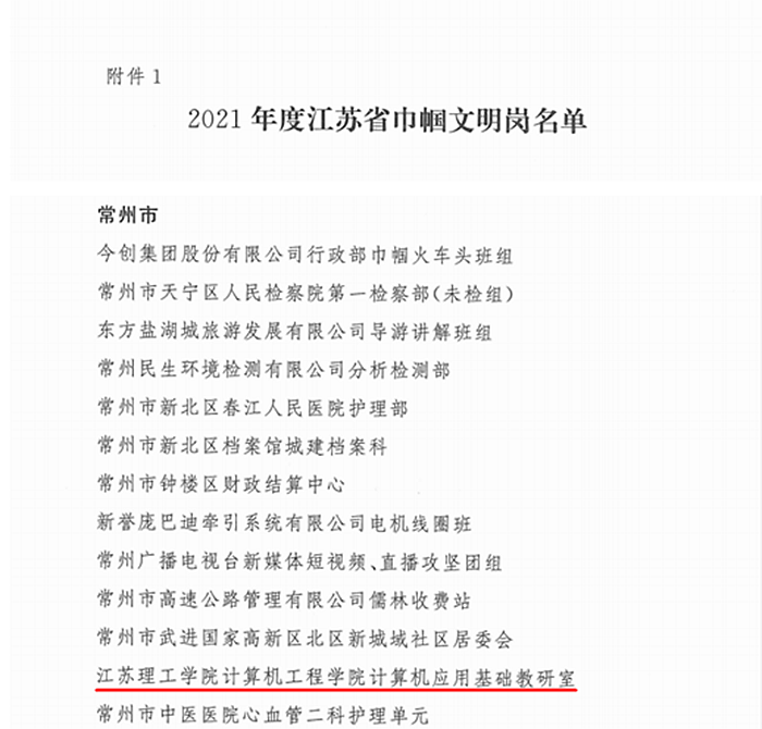 为激励先进、树立典型,进一步引领和激发广大城乡妇女在促进经济社会发展中提升素质、建功成才、奉献力量。近日,省城镇妇女“巾帼建功”活动领导小组、省妇女“双学双比”竞赛活动领导小组、省妇女联合会联合发文,命名了一批2021年度全省城乡妇女岗位建功先进典型,我校计算机工程学院计算机应用基础教研室获评江苏省“巾帼文明岗”称号。这是继2019年我校教育学院心理学系获此荣誉后,我校再获此殊荣。