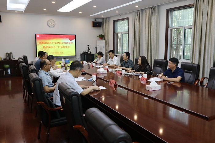 6月8日上午,苏州信息职业技术学院党委副书记、院长陈德斌一行来校调研交流。校党委副书记、校长崔景贵,校党委常委、副校长贝绍轶及我校教务处、学生工作处、应用技术学院相关负责人在正德楼第二会议室参加了调研交流。