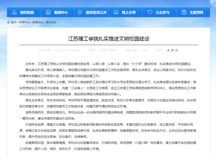 2022年6月10日,江苏省教育厅门户网站“高校动态”栏目以《江苏理工学院扎实推进文明校园建设》为题,聚焦我校近年来以文明校园创建总揽全局,以细入微、以微入实,强化“六个好”建设标准,扎实推进文明校园建设。(编辑/吴婷;审核/张羽程)