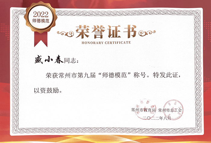 近日,在常州市教育局、常州市总工会组织的第九届师德标兵和师德模范评选活动中,我校计算机工程学院盛小春老师荣获常州市第九届“师德模范”称号。