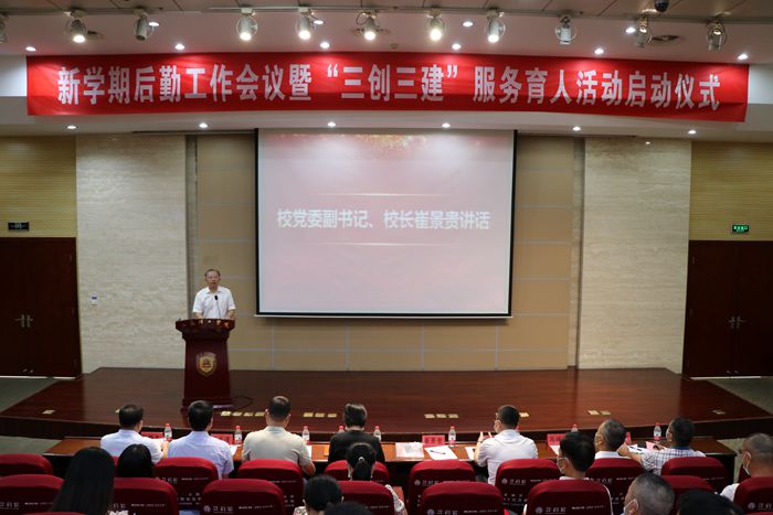 9月9日下午,新学期后勤工作会议暨“三创三建”服务育人活动启动仪式在图书馆南报告厅举行,校党委副书记、校长崔景贵,党委常委、副校长俞亚萍出席,后勤保障处领导班子全体成员及班组长以上管理人员参加了会议。会议由后勤党总支书记杨银忠主持。