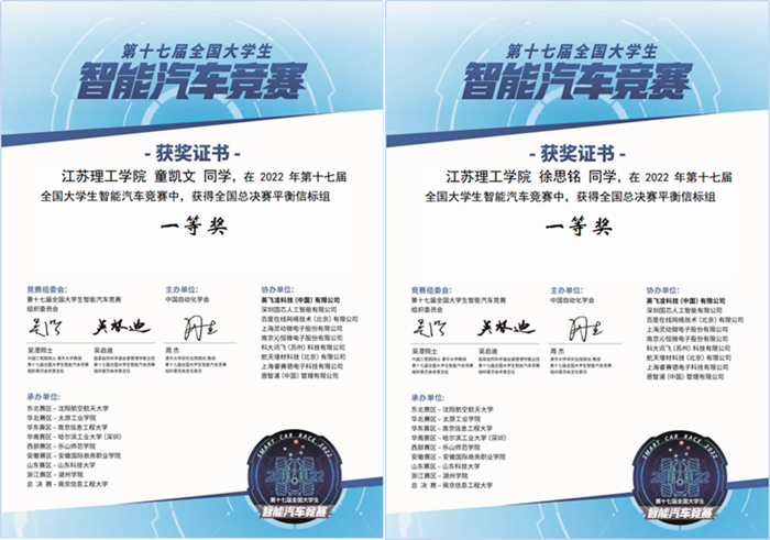 日前,第十七届全国大学生智能车竞赛全国总决赛在南京信息工程大学举行,由于疫情防控要求,各赛点采取线下比赛为主,线上比赛为辅的形式。我校电气信息工程学院智能车俱乐部20余名队员参加了线下比赛,期间同学们通过优化信号处理和电机控制算法,克服了赛场光线不均匀和地面摩檫力偏小等不利因素,最终取得了国家一等奖1项,国家二等奖2项,创我校参加该项赛事历史最好成绩。其中,徐思铭、童凯文等同学组成的“凌波二队”获得全国总决赛平衡信标组国家级一等奖,孟鑫、张琪、谢高骏等同学组成的“凌波三队”获得全国总决赛智能视觉组二等奖,缪晴蔚、宋海涛等同学组成的“厉风者”获得全国总决赛平衡单车组二等奖。另外,徐思铭、麻凯阳等同学取得群体灭灯组全国总决赛第7名的好成绩。