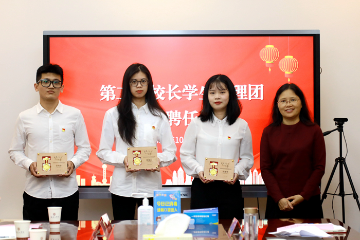 首届学生助理团副团长蒋雅梦汇报了过去一年助理团的工作开展情况。周兰珍向首届学生助理团代表赠送纪念牌。校团委组织宣传部部长王一宁通报新一届学生助理遴选组成情况。第二届校长学生助理代表徐枫燕、何桂彤发言,表示会快速融入团队,凝聚力量,以问题为导向,坚持守正创新,充分发挥“下情上达、上情下达、调查研究、参谋决策、推动落实”的职能,为学校事业发展积极建言献策。