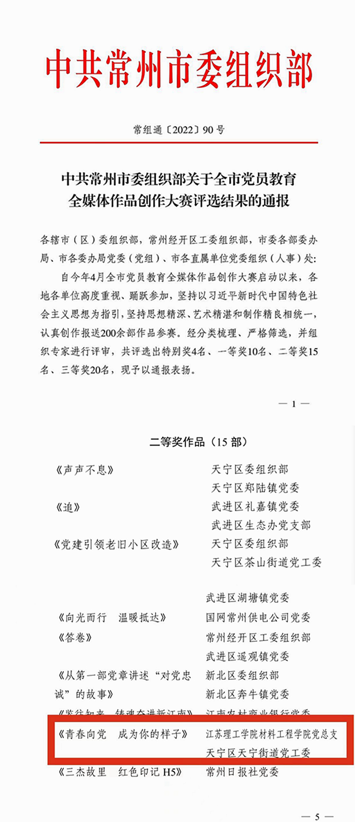 日前,由中共常州市委组织部举办的全市党员教育全媒体作品创作大赛公布评审结果,我校材料工程学院党总支与天宁区天宁街道党工委共同推送的党员教育新媒体作品《青春向党 成为你的样子》荣获二等奖。