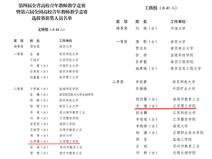 第四届全省高校青年教师教学竞赛于8月25日在南京圆满结束,我校机械工程学院教师史璠和文化与旅游学院教师许梦婕分获工科组和文科组二等奖。
