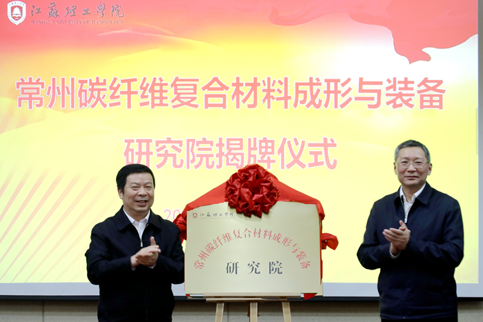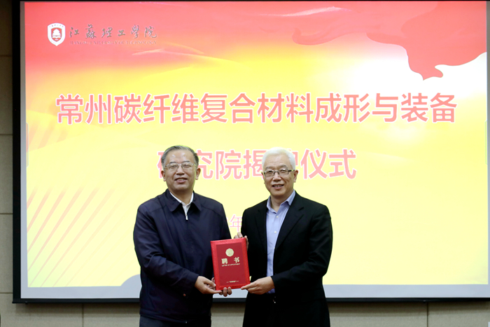 崔景贵为王荣国颁发江苏理工学院特聘教授聘书并佩戴校徽。戴源与朱林生为常州碳纤维复合材料成形与装备研究院揭牌。