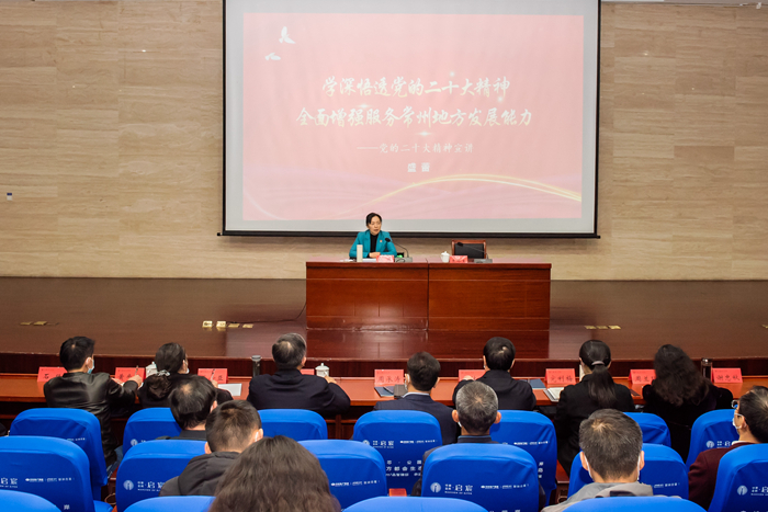 11月17日,市委宣讲团成员、市长盛蕾来校宣讲党的二十大精神并调研。她强调,要切实把党的二十大精神贯彻落实到办学治校全过程各方面,全面落实立德树人根本任务,为党育人、为国育才,努力办好人民满意的教育,全面增强服务地方发展能力,为奋力书写好中国式现代化常州答卷作出新的更大贡献。