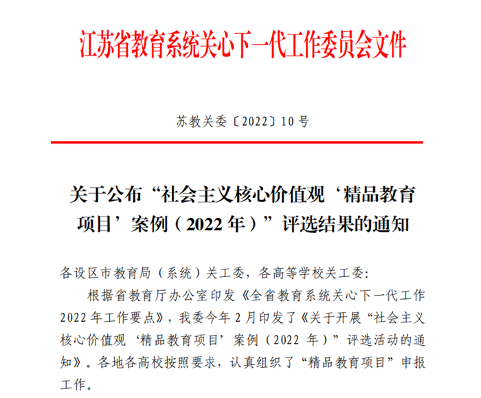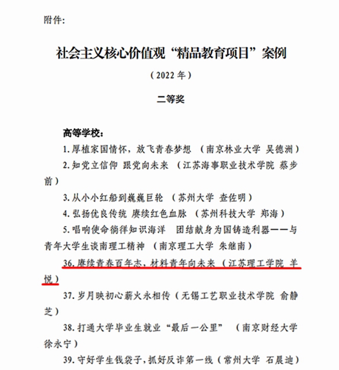近日,江苏省教育系统关心下一代工作委员会公布了2022年度“社会主义核心价值观精品教育项目案例”评选结果(苏教关委〔2022〕10号文),我校关工委报送的《赓续青春百年志,材料青年向未来》项目荣获二等奖。这是我校首次获得该评选活动奖项。
