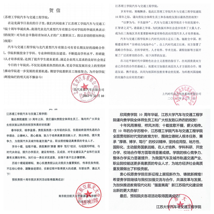 南京航空航天大学、江苏大学、武汉理工大学、山东理工大学、重庆交通大学、长安大学、中汽研(常州)检验中心、上汽时代动力电池系统有限公司、北汽重型汽车有限公司、常州新能源汽车研究院等兄弟高校、校企合作单位、科研合作教授等纷纷发来贺信和祝贺视频。