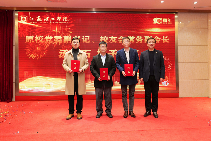 汤建石代表学校校友总会、校友办,对汽车与交通工程学院校友分会成立表示热烈的祝贺,对多年来关心支持江苏理工学院发展的校友及社会各界朋友们表示衷心的感谢。他表示学校培养了一批又一批国家建设栋梁之材,母校的每一点发展进步都离不开校友的大力支持。校友会作为一个开放交流的平台,是每个校友分享成功与喜悦,传递友情和价值的精神家园,是大家联系母校、联络校友的感情纽带。希望各位校友多联络、多走动、多支持,遇有校友喜庆的消息,互相欣赏,转告分享。汤建石代表学校为汽车与交通工程学院校友分会第一届理事会成员代表颁发聘书。