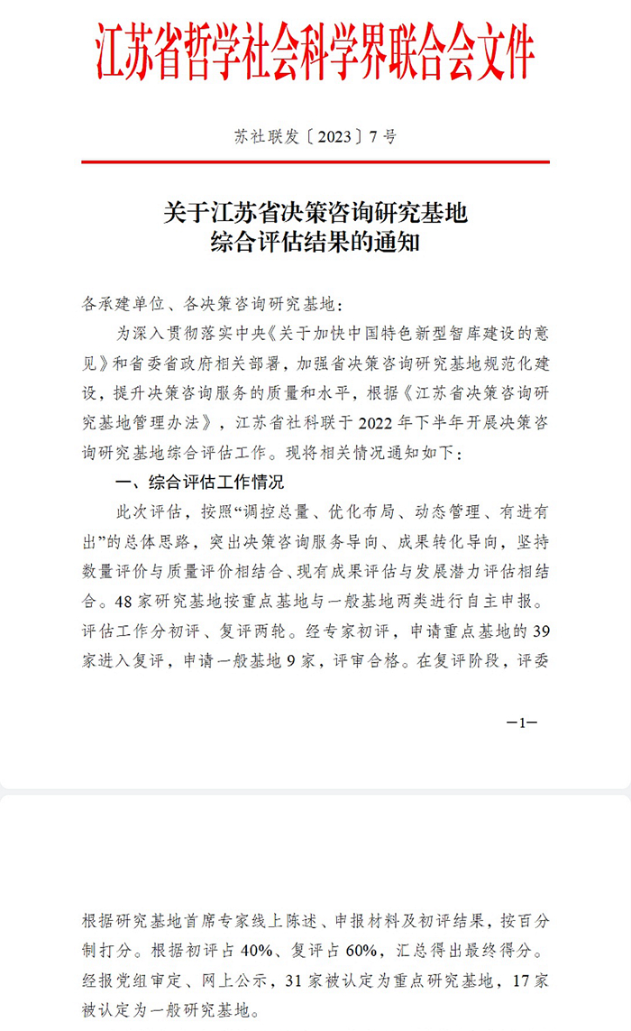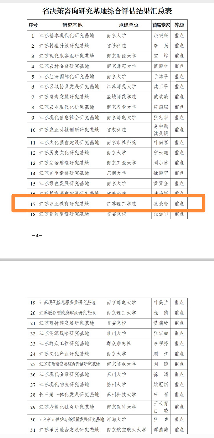 近日,江苏省社科联公布了江苏省决策咨询研究基地综合评估结果,我校申报承建的江苏职业教育研究基地成功获评江苏省决策咨询重点研究基地,实现了社科研究平台建设的新突破。