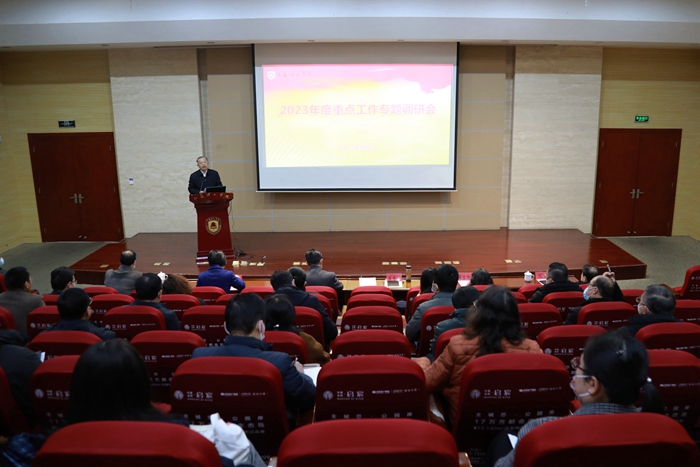 为科学谋划学校2023年重点工作,加强工作系统性、前瞻性和计划性,扎实推进“十四五”规划落深落细落实,统筹推进学校高质量发展,2月6日,我校在图书馆南报告厅举行2023年重点工作专题调研会。校党委书记崔景贵,党委副书记、校长戴国洪,校领导班子其他成员及各职能部门、教辅单位和各教学单位主要负责人参加会议。