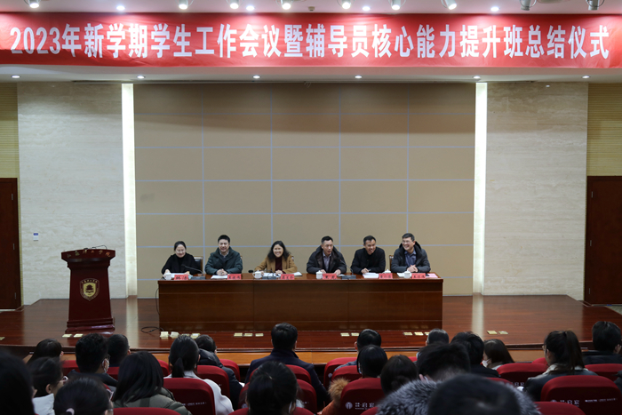 2月15日下午,我校在图书馆南报告厅举行新学期学生工作会议暨辅导员核心能力提升班总结会。校党委副书记周兰珍,教务处、学生工作处、保卫处、后勤保障处、团委等职能部门负责人,全体学生工作人员参加会议。会议由党委学生工作部部长、学生工作处处长王振伟主持。
