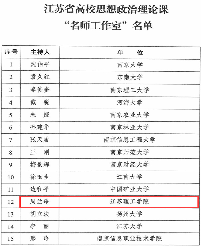 近日,中共江苏省委宣传部和中共江苏省委教育工委联合发布了《关于设立江苏省高校思想政治理论课“名师工作室”的通知》(苏宣通[2023]8号),我校周兰珍教授团队申报的工作室获批江苏省高校思想政治理论课“名师工作室”。全省共有15个工作室批准立项建设。