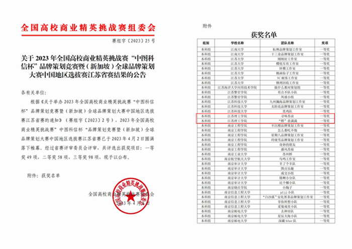 近日,2023年全国高校商业精英挑战赛“中图科信”杯品牌策划竞赛暨(新加坡)全球品牌策划大赛中国地区选拔赛江苏省赛成绩公布。我校学子获一等奖2项,二等奖1项、三等奖4项的优异成绩。由管理学院葛莹玉老师指导的卢美琪团队、杨惠敏团队获得一等奖;由经济学院陈利馥老师指导的刘雪团队获得二等奖;由管理学院姜鸿运老师指导的赵阳团队,由葛莹玉老师指导的张馨月团队、胡冰洋团队获得三等奖,由经济学院曹乃佳老师指导的刘露团队获得三等奖。