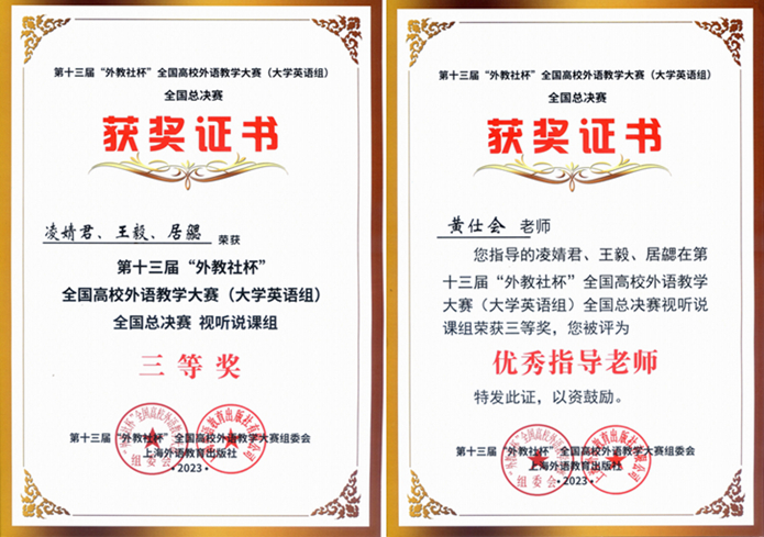 近日,第13届“外教社杯”全国高校外语教学大赛全国决赛、总决赛在上海外国语大学闭幕。本次赛事汇聚60位全国省赛选拔出的特等奖选手,经过激烈的角逐,我校外国语学院凌婧君、王毅、居勰竞赛团队代表江苏省参加全国总决赛,荣获大学英语(视听说组)全国三等奖,黄仕会老师荣获优秀指导老师奖。