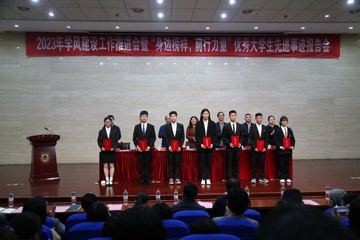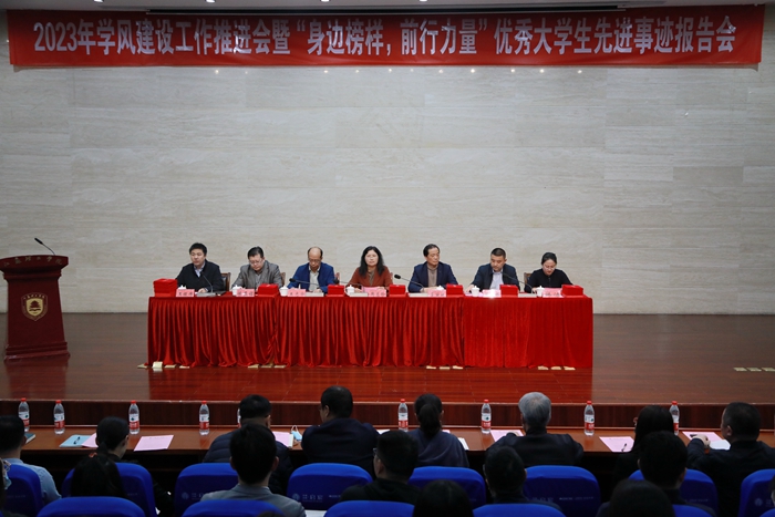 为进一步推进学风建设工作,营造良好的育人氛围,4月14日下午,我校在图书馆北报告厅召开2023年学风建设工作推进会暨“身边榜样,前行力量”优秀大学生先进事迹报告会。校党委副书记周兰珍,党委宣传部、教务处、学生工作处、保卫处、后勤保障处、团委等相关职能部门负责人以及各二级学院分管学生工作领导、辅导员、获奖学生代表等300余人参加了会议。大会由学生工作处处长王振伟主持。