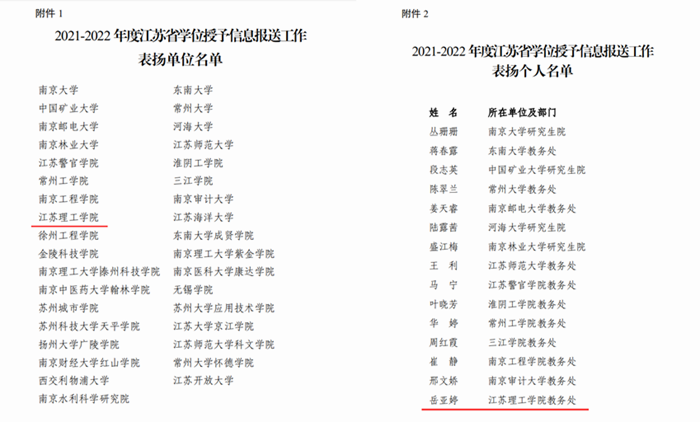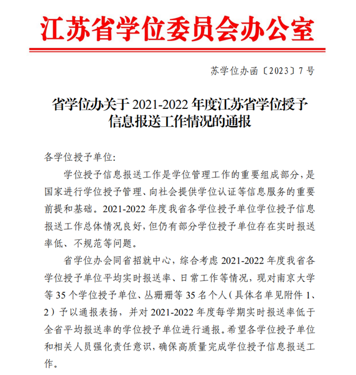 近日,江苏省学位委员会办公室发布《省学位办关于2021-2022年度江苏省学位授予信息报送工作情况的通报》(苏学位办函〔2023〕7号),我校获评“表扬单位”,教务处学籍中心岳亚婷老师获评“表扬个人”。