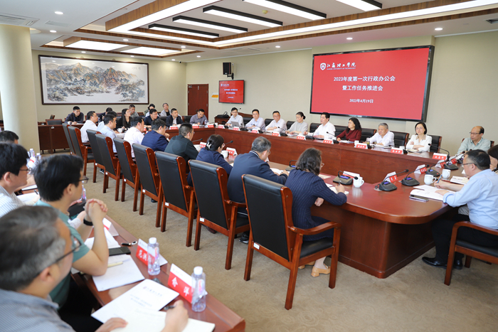 4月19日下午,我校在图书馆四楼会议室召开2023年度行政办公会暨工作任务推进会。校党委副书记、校长戴国洪,党委副书记周兰珍,党委常委、副校长蒋心亚,副校长谢忠秋,党委常委、副校长贝绍轶、俞亚萍出席会议,行政机关各部门、各二级学院行政负责人参加了会议,会议由戴国洪主持。