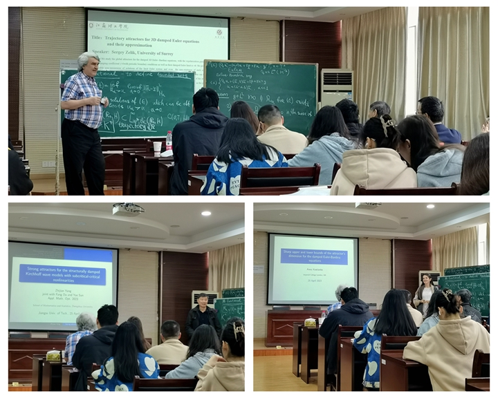 4月25日,专家学术报告会在数理学院报告厅举行。英国萨里大学Sergey Zelik教授、伦敦帝国理工学院Anna Kostianko教授、郑州大学杨志坚教授和兰州大学孙春友教授分别做了题为《Trajectory attractors for 3D damped Euler equations and their approximation》《Sharp upper and lower bounds of the attractor dimension for 3D damped Euler-Bardina equations》《Strong attractors for the structurally damped Kirchhoff wave models with subcritical-critical nonlinearities》《Kolmogorov $\varepsilon$-entropy for uniform attractors of dissipative PDEs》专场学术报告,数理学院60余名师生参加了报告会并与专家展开了热烈讨论。