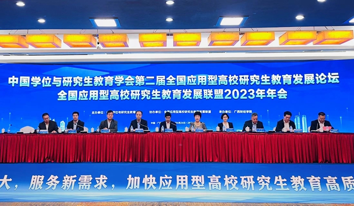 4月24日—27日,全国应用型高校研究生教育发展联盟2023年年会暨第二届全国应用型高校研究生教育发展论坛在广西南宁召开,本次论坛由中国学位与研究生教育学会和全国应用型高校研究生教育发展联盟主办,广西财经学院承办。全国近90所高校200余名代表参加。我校党委副书记、校长戴国洪,机械工程学院院长叶霞,资源与环境工程学院院长叶招莲,研究生处处长雷卫宁及研究生处相关人员参加了论坛。