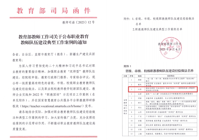 近日,教育部教师工作司发布了《关于公布职业教育教师队伍建设典型工作案例的通知》。我校省高职师培中心报送的《模块化课程 行动式参与 体验中成长——高职院校新入职教师培训的江苏实践》获评入选。