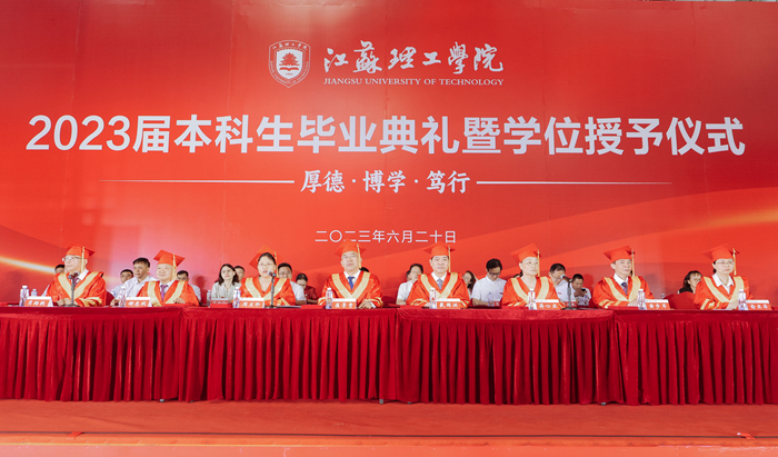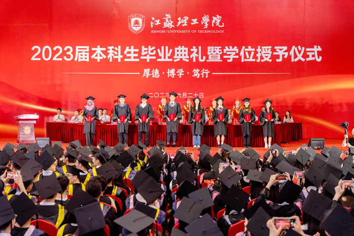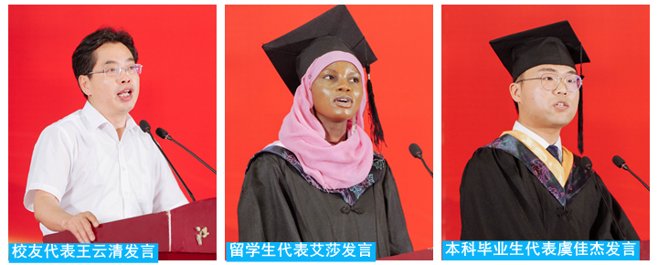 毕业生代表、汽车与交通工程学院虞佳杰分享大学四年的成长和收获,表达了对母校、师长的感恩与不舍,承诺将继续秉承“厚德、博学、笃行”的校训精神,勇担社会责任,在实现中国梦的实践中绽放青春光彩。国际教育学院留学生代表艾莎感谢学校一路的引导和呵护,让她顺利度过温暖、快乐、充实的大学时光,表示毕业后会继续传播中华优秀传统文化。我校90届杰出校友、江苏省特级教师、江苏省职业教育领军人才、江苏省溧阳中等专业学校党委书记、校长王云清回顾了在母校的求学经历,感激母校的培育之恩,勉励学弟学妹以岗位立身,用时间打磨水平,以责任支撑发展,用兴趣激发激情,以反思促进成长。毕业典礼现场还播放了各二级学院院长提前录制好的视频,表达了老师对毕业生的殷殷嘱托和热切期盼。