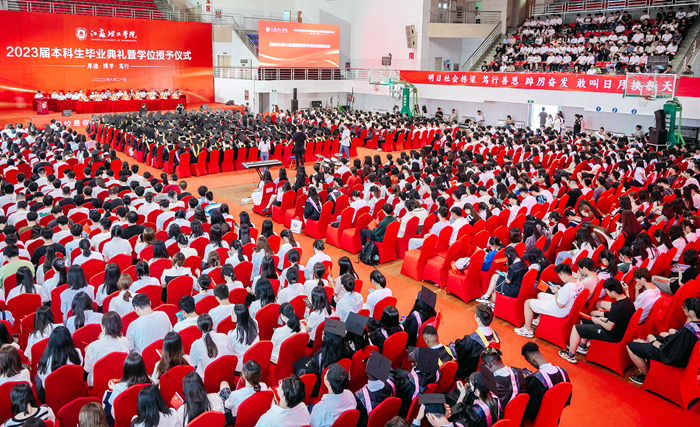 6月20日上午,我校2023届本科生毕业典礼暨学位授予仪式在体育馆举行。校领导崔景贵、戴国洪、周兰珍、蒋心亚、谢忠秋、黄步军、贝绍轶、俞亚萍,校学位评定委员会委员,相关职能部门负责人,各二级学院院长、分管学生工作副书记、辅导员、班主任,以及1500余名2023届本科毕业生代表参加毕业典礼。典礼由校党委副书记周兰珍主持。