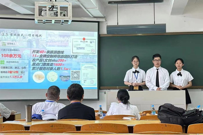 备赛过程中,参赛团队在指导老师的指导下,反复修改完善创业计划书与路演PPT内容,对项目内容进行优化。项目着眼社会发展现状,聚焦社会需求与痛点,融合旅游与电商发展新场景,致力打造电商新业态和新模式。路演答辩环节,参赛团队就市场分析、产品的服务、商业模式、财务分析等模块业务进行生动展示,项目立足电商新模式、注重创新创业、扎根实践等特色。