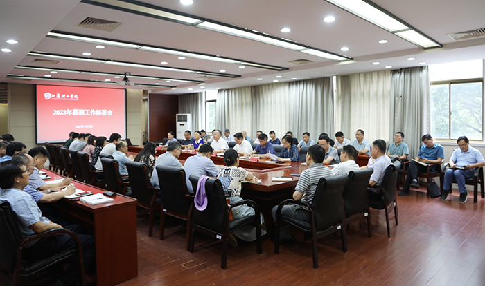 7月9日下午,我校在厚德楼220会议室召开2023年暑期工作部署会。校党委书记崔景贵,党委副书记、校长戴国洪,党委副书记周兰珍,党委常委、纪委书记、派驻监察专员黄步军,党委常委、副校长贝绍轶、俞亚萍出席会议,各单位、各部门负责人参加了会议。会议由崔景贵主持。