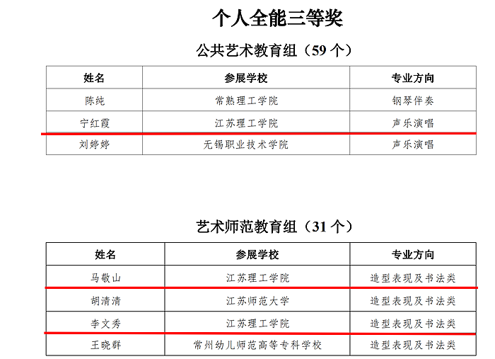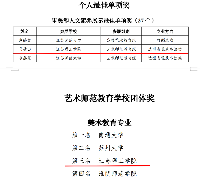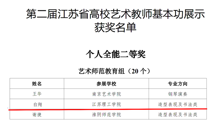近日,江苏省教育厅公布了第二届江苏省高校艺术教师基本功展示活动获奖名单,我校艺术设计学院教师白翔获得艺术师范教育组个人全能二等奖,艺术设计学院教师马敬山获得艺术师范教育组个人全能三等奖、审美和人文素养展示最佳单项奖,艺术设计学院教师李文秀和教育学院教师宁红霞分获艺术师范教育组和公共艺术教育组个人全能三等奖,我校获得艺术师范教育学校团体奖。