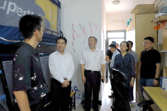 校领导和学生代表亲切交谈,关切询问学生暑期学习生活、学科专业竞赛和社会实践情况,希望宿舍同学团结友爱、互帮互助,再接再厉、共同进步,勉励他们继续勤奋刻苦学习、追求更高理想,筑梦圆梦新学期,携手奋进向未来。校领导叮嘱有关部门和二级学院,要进一步协同做好学生群体的关心关爱工作,同时要强化时时放心不下的责任意识,全面排查整治校园安全隐患,及时做好安全健康教育和后勤管理服务工作,全力保障秋季学期学校开学正常有序。(文/学生工作处 周阳、李金东;审核/王振伟;图/编辑 许琳、蒋相杰)