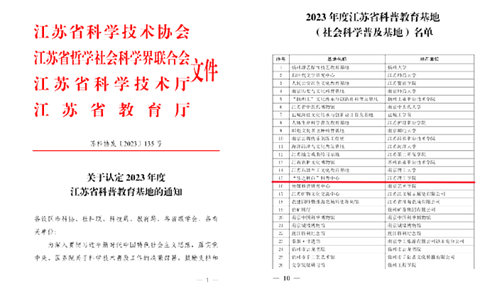 近日,江苏省哲学社会科学界联合会等四部门联合下发《关于认定2023年度江苏省科普教育基地的通知》(苏科协发〔2023〕135号),我校“乐之秋白”科普中心被认定为“2023年度江苏省科普教育基地(社会科学普及基地)”(2023-2026),常州市民营经济研究所、常州名人研究院顺利通过考核验收,开启新的建设周期。至此,我校拥有省社科普及基地累计达到3个,成为在常高校中省社科普及基地建设历时最长、数量最多、面向最广的高校。