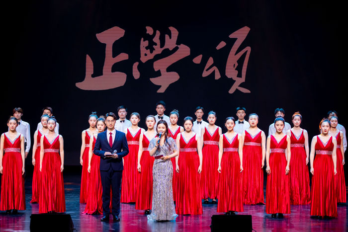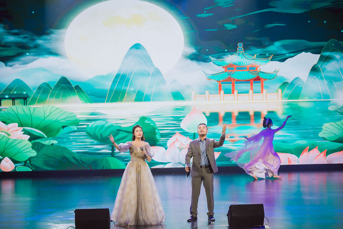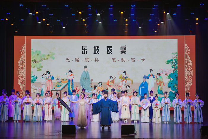 晚会在文化与旅游学院大学生气势恢弘的大合唱《正学颂》中拉开帷幕,文言文写就的歌词铿锵有力,传递“00后”文化传承向上向善的力量。由校团委招募的汉服国风社带来的《东坡夜宴》以沉浸式歌舞演艺方式,创新展示东坡与好友、弟子的君子情谊,让传统文化映照现代生活。我校教工舞蹈团龙一平、单文霞、靳婷婷、毛沁红等成员,在只此青绿的水墨画间翩翩起舞,宋式美学扑面而来。教育学院梁庆东、校团委贾宁慧男女声二重唱《锦瑟》如高山流水、婉转动听,将诗词之美展现得淋漓尽致。常州市东坡小学师生精心编排的情景剧《又见东坡》、合唱《像你一样的人》展现现代化诗书校园里的孩子们学习东坡文化,传承东坡精神,千年文脉在时代新人身上得到传承。常州朗诵吟诵艺术协会秦坚毅、蒋涌涛带来“梦回大宋”宋韵诗词会,曾登上过央视的京剧《东坡夜泊舣舟亭》讲述了东坡与常州城的动人故事。
