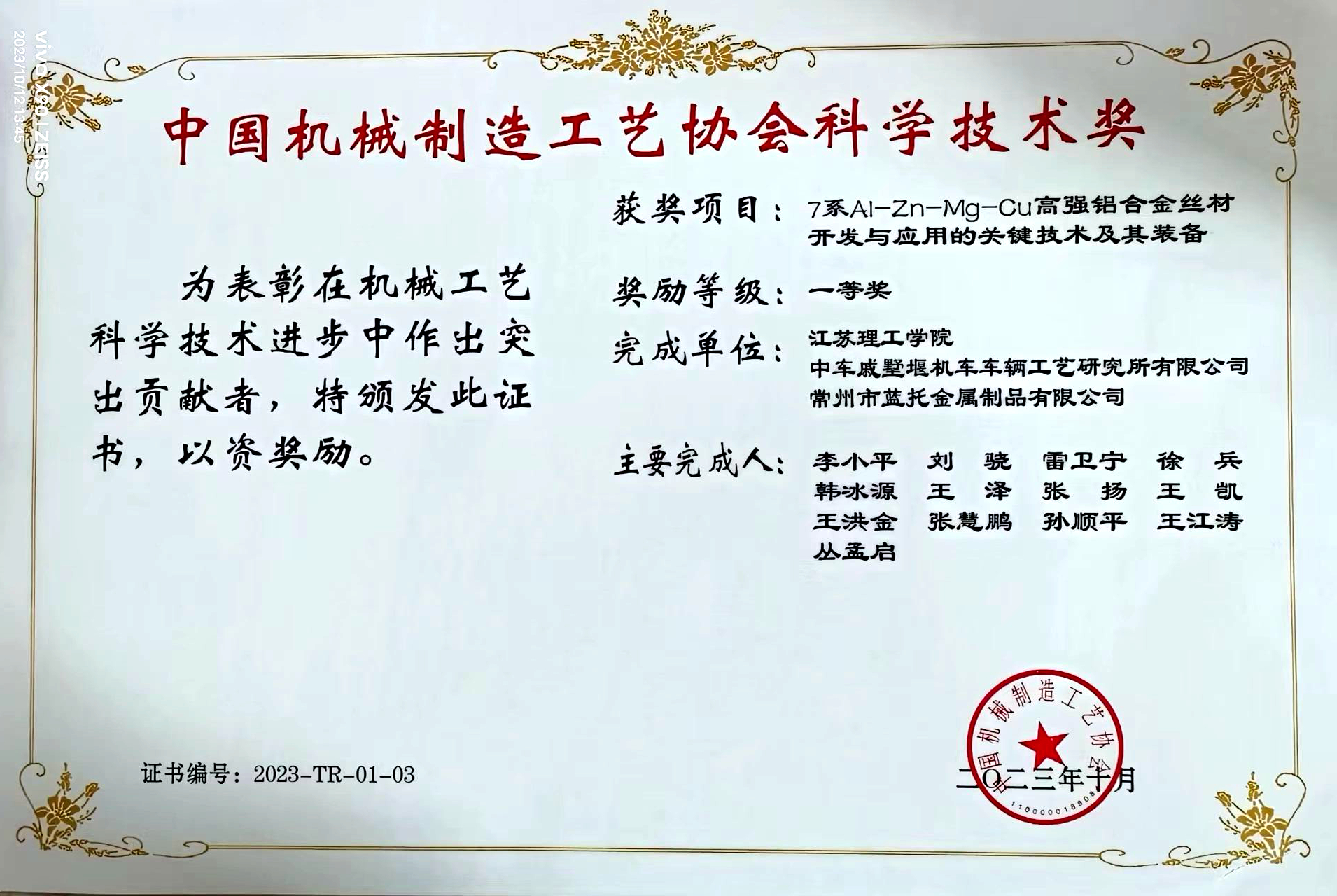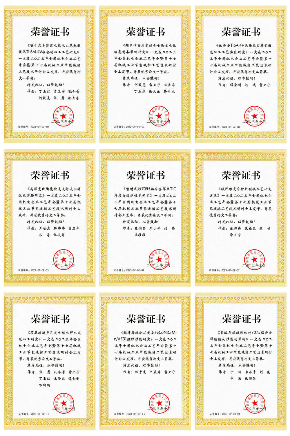 会上,我校李小平教授领衔的项目“7系Al-Zn-Cu高强铝合金丝线材开发与应用的关键技术及其装备”获中国机械制造工艺科学技术奖一等奖。我校荣获2023年机械制造工艺协会“优秀会员单位”荣誉称号和2023年中国机械制造工艺协会优秀论文组织奖。丁玉红、何毅亮等9位研究生提交的学术论文获年会优秀论文奖,其中一等奖2项,二等奖5项,三等奖2项,获奖人数在高校中名列前茅。雷卫宁教授和李小平教授应邀分别作《超声复合电弧熔覆高熵合金涂层技术研究》《7系Al-Zn-Mg-Cu超高强铝合金丝材开发与应用的关键技术及其装备》的大会报告。
