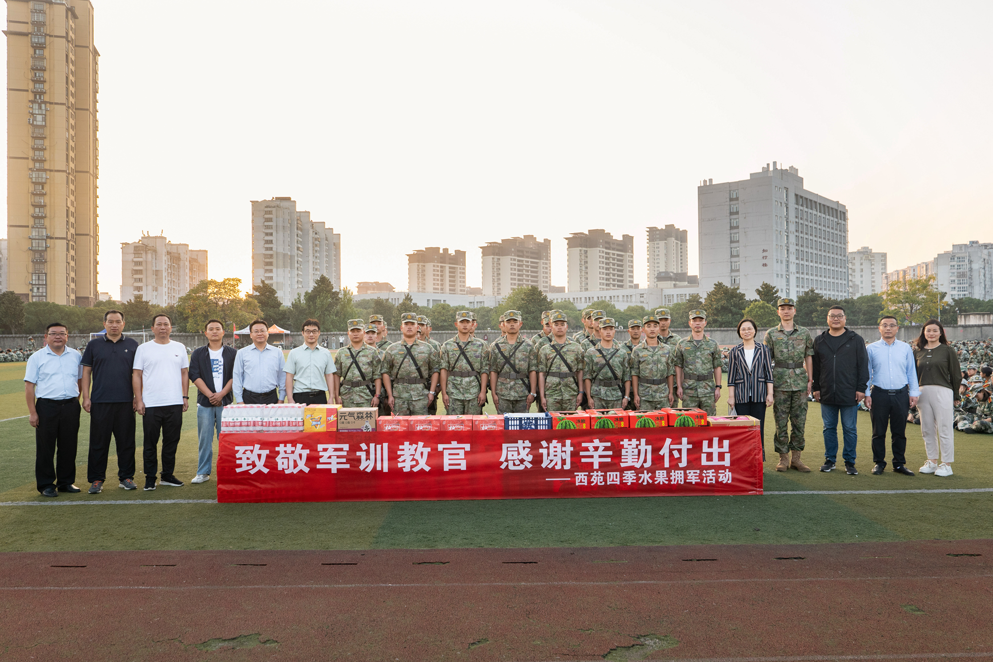 金秋十月的校园,军歌嘹亮,青春飞扬。10月18日下午,校资产经营公司组织协调商业街经营户四季水果向忙碌在我校军训一线的教官献上一批精心挑选的水果、饮料,以支持学校新生军训工作。校党委常委、副校长俞亚萍代表学校武装部接受并向承训部队官兵转交了这份爱心捐赠。党委常委、副校长范洪辉也对友情赞助表示感谢,并充分肯定了资产经营公司对学校新生军训工作的支持。