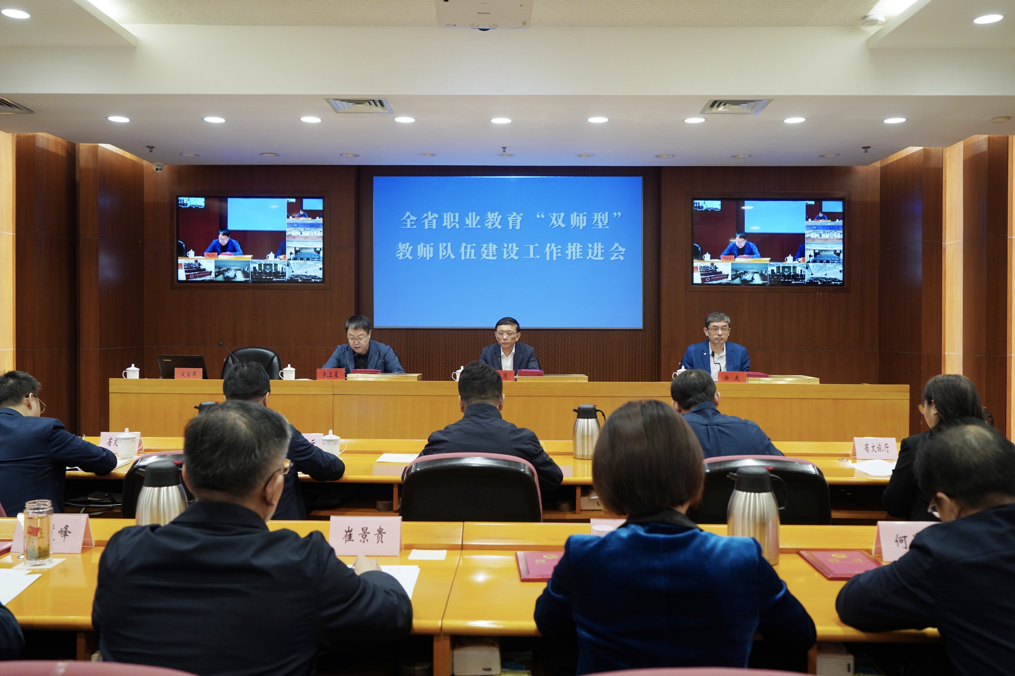 10月20日上午,全省职业教育“双师型”教师队伍建设工作推进会在省教育厅402会议室举行。江苏省委教育工委副书记潘漫、省教育厅教师工作处处长张卫星、职业教育处处长徐庆出席会议。省发改委、人社厅、工信厅、教育厅等相关处室负责人,有关高职院校相关负责人,我校党委书记崔景贵,校党委常委、副校长王志华,职教学部党总支书记、省高职师培中心主任聂伟进等参加会议。会议由张卫星主持。我校在图书馆南报告厅设立分会场,教务处、职教学部和相关二级学院有关人员在线上参加会议。