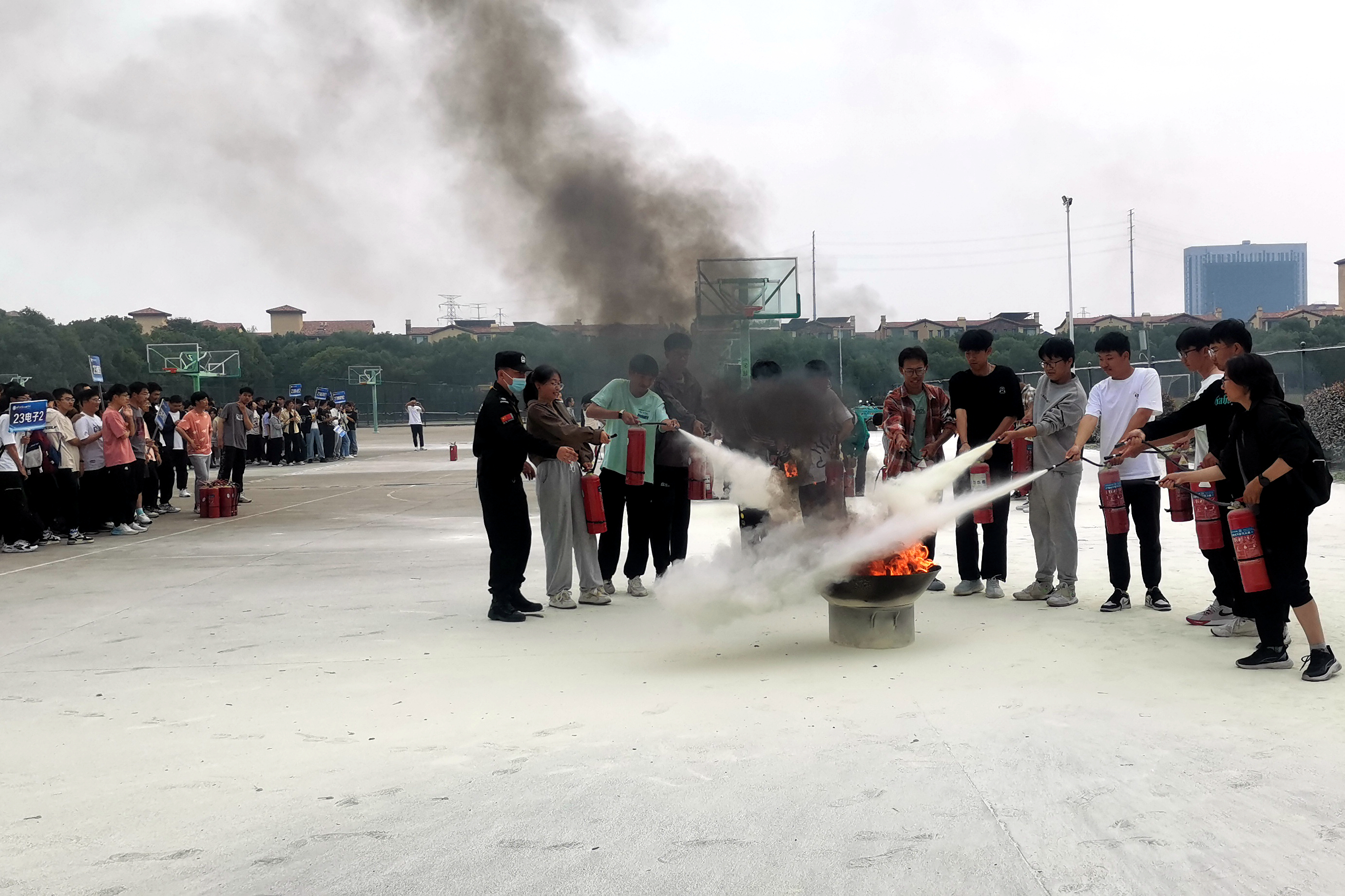 为进一步增强2023级新生消防安全意识,提升补救初起火灾的能力,筑牢校园消防安全“防火墙”,我校利用两个下午的时间在西苑篮球场分批对所有新生进行消防灭火演练。