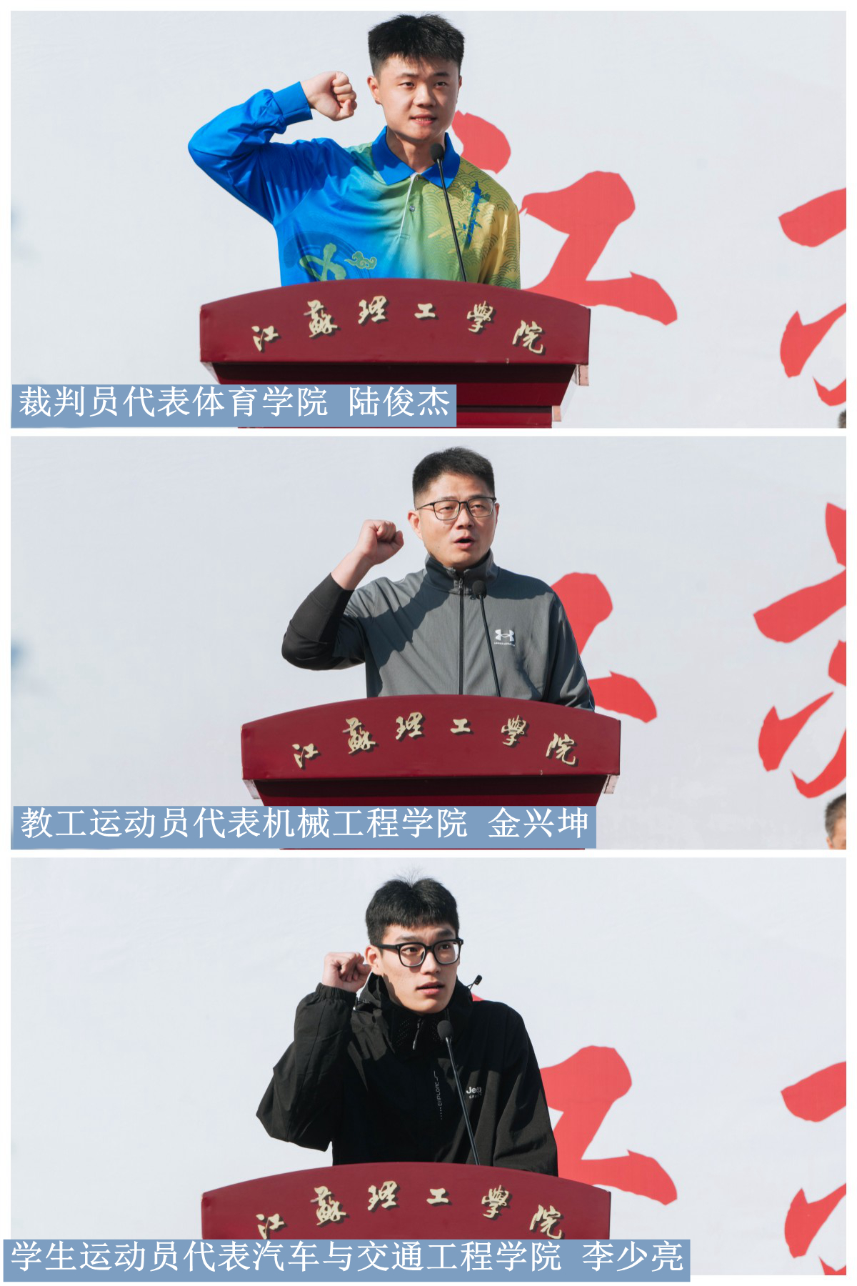 裁判员代表体育学院陆俊杰、教工运动员代表机械工程学院金兴坤、学生运动员代表汽车与交通工程学院李少亮分别宣誓。