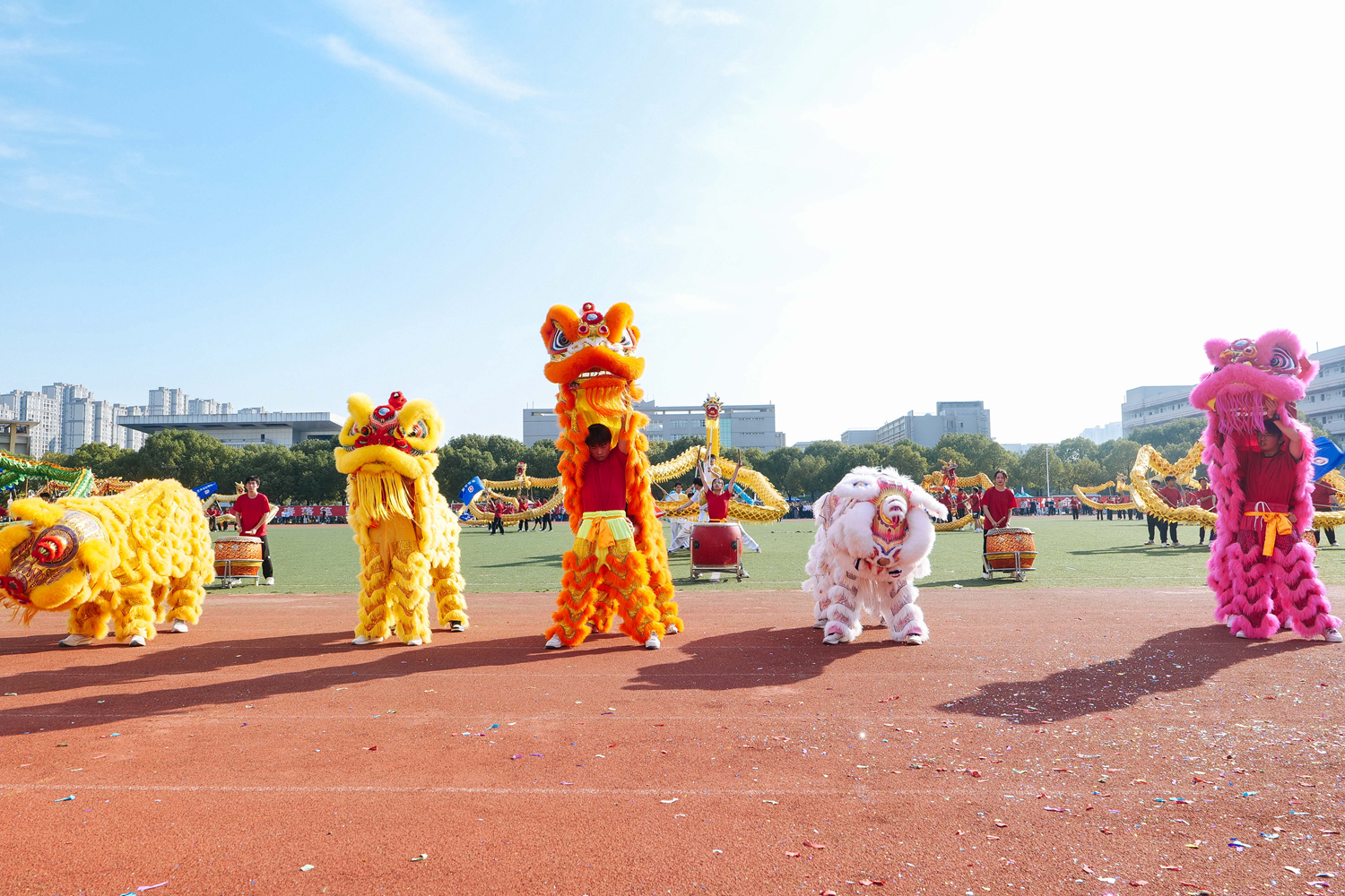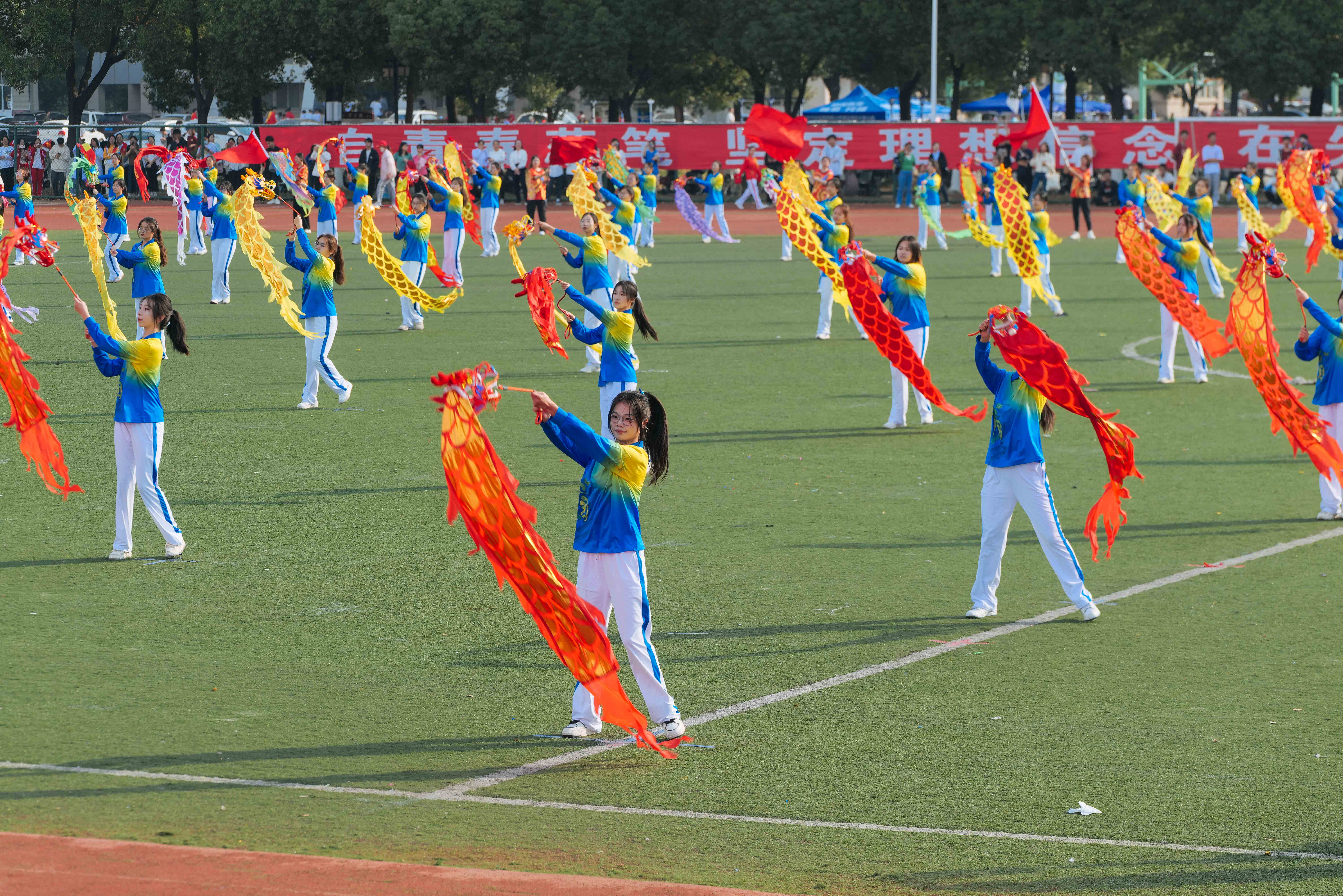 我校啦啦操、排舞协会,校健身操舞协会和校舞龙舞狮协会呈现了《轻舞飞扬 我和我的国》《彩带飞扬 龙舞盛世》《龙腾狮跃耀中华》等精彩表演。