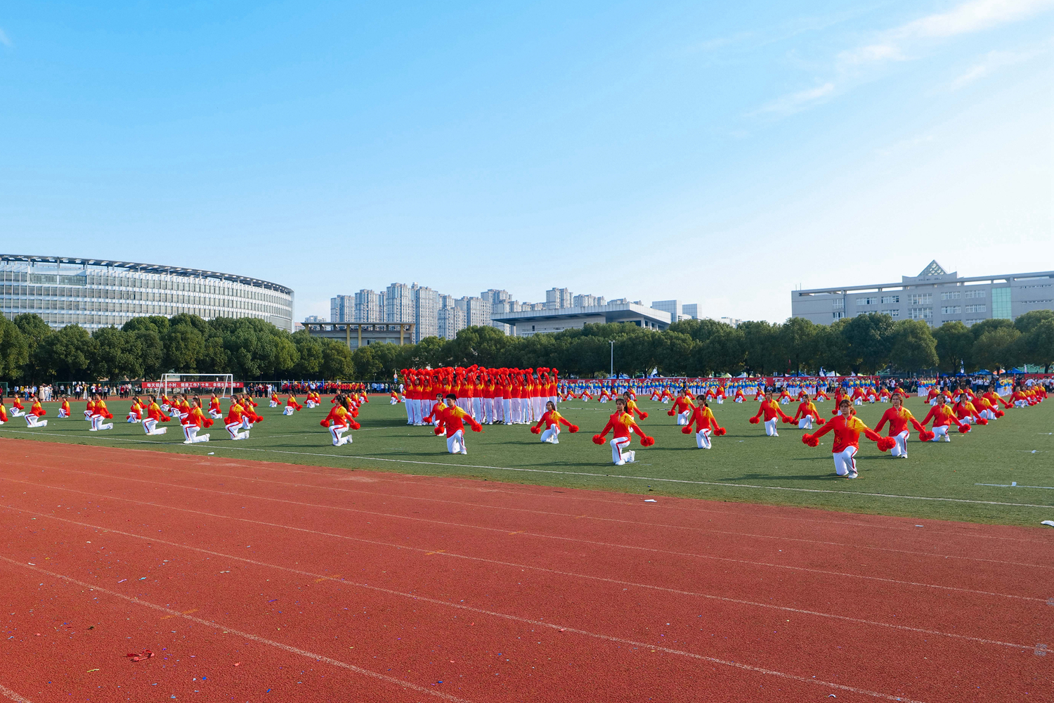 伴着激昂的音乐,学校各部门、各学院的教职工和学生运动员代表迈着整齐的步伐,意气风发地步入体育场。