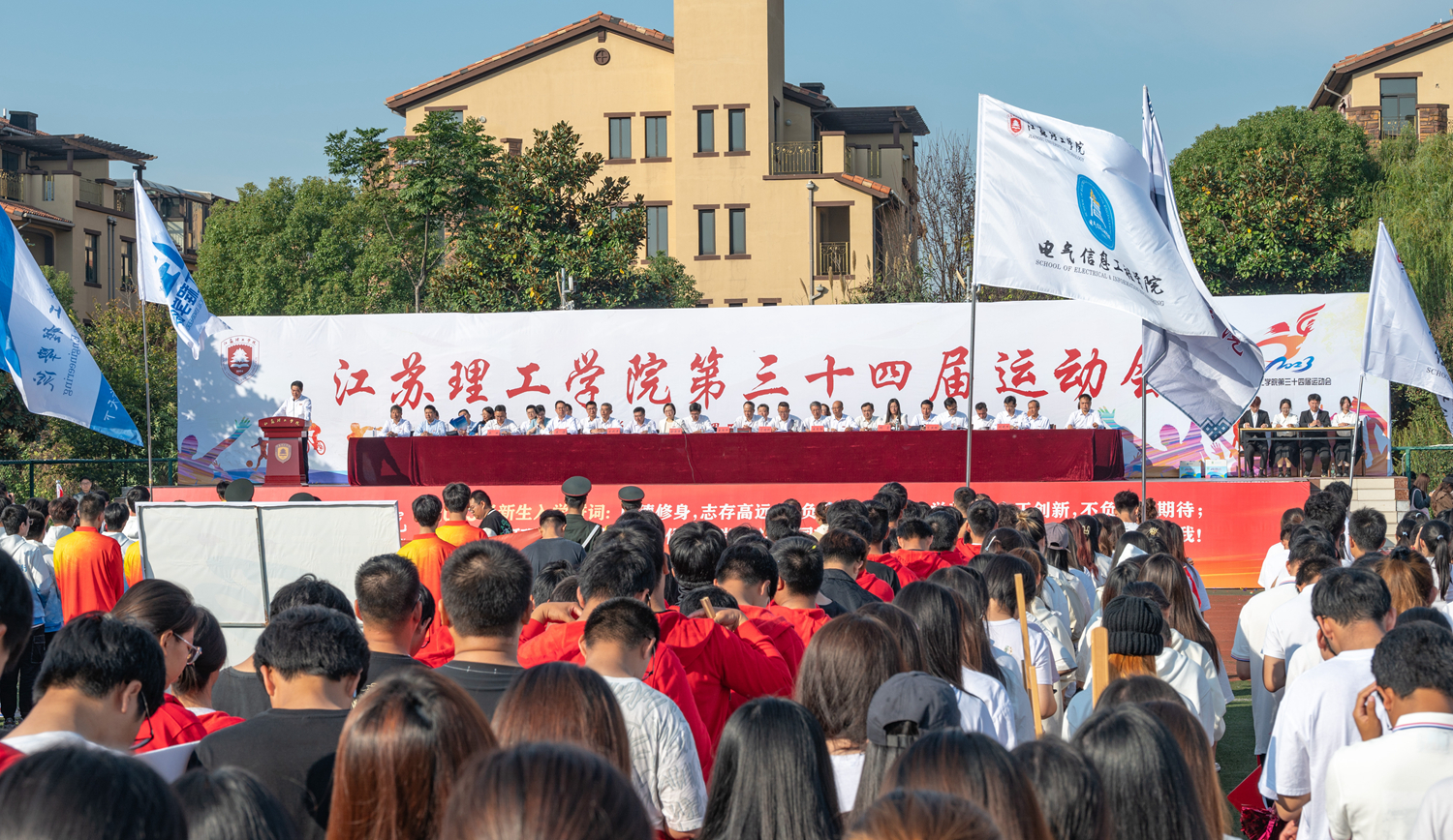 党委副书记、校长戴国洪致开幕词并宣布江苏理工学院第三十四届运动会开幕。戴国洪表示,国运兴则体育兴,体育强则中国强。近年来,党和政府提出“把学校体育工作摆在更加突出位置,构建德智体美劳全面培养的教育体系”。长期以来,我校高度重视体育事业发展,积极培育和优化体育社团组织,加强和改进学校体育教学工作,体育的“三全育人”功能进一步彰显,体育教学和竞赛工作取得优异成绩。希望全校体育教育工作者、广大师生员工发挥“养德、益智、勤劳、尚美”的体育育人作用,探索更好开展高校体育运动的方法和路径,以体育推动德育、智育、美育、劳动教育一体推进、五育并举,全面增强健身、健康、健美意识,强壮体魄、快乐工作。戴国洪强调,全校上下要深入学习贯彻习近平总书记关于体育强国建设的重要论述,发扬“惟实励新,追求卓越”的办学精神,把体育育人作为立德树人的重要抓手,搭建平台、创造条件,推动学校办好更为适合、更加优质、更具特色、更有情怀的高等教育,始终在追求卓越的一流应用型大学建设新征程上争当表率、争做示范、走在前列,以“更快、更高、更强、更团结”的精神状态,奋力书写好中国式现代化江苏新实践的江理工新答卷