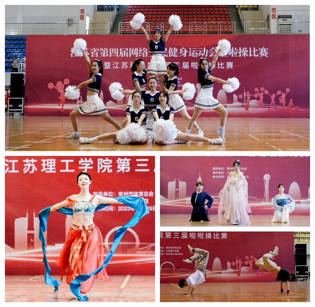 日前,江苏省第四届网络全民健身运动会啦啦操比赛(常州站)暨江苏理工学院第三届啦啦操比赛在我校体育馆举行。